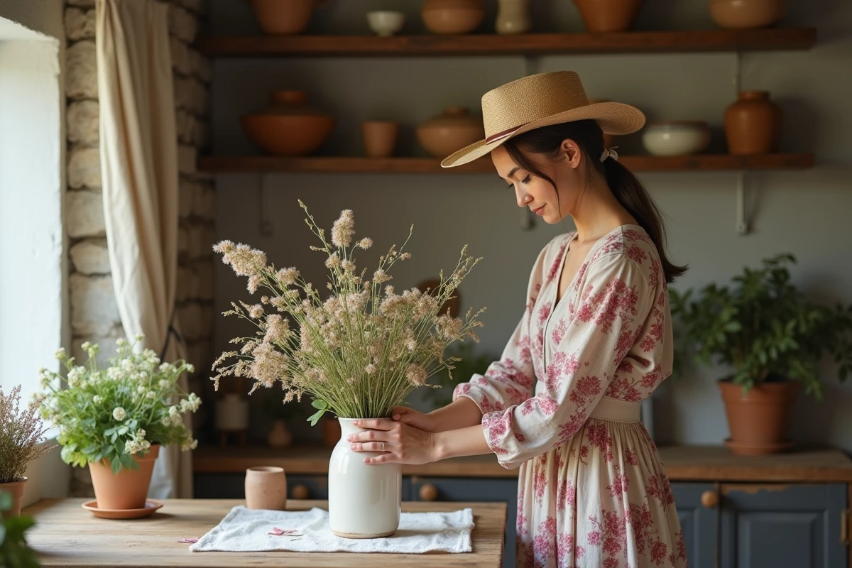 Pour une décoration champêtre réussie, privilégiez les matériaux bruts. Le bois, la pierre et le métal vieilli apportent une touche d’authenticité. Rehaussez ces éléments avec des plantes vertes : fougères, eucalyptus ou encore lavande séchée. Elles ajoutent une note de fraîcheur tout en renforçant le lien avec la nature.
